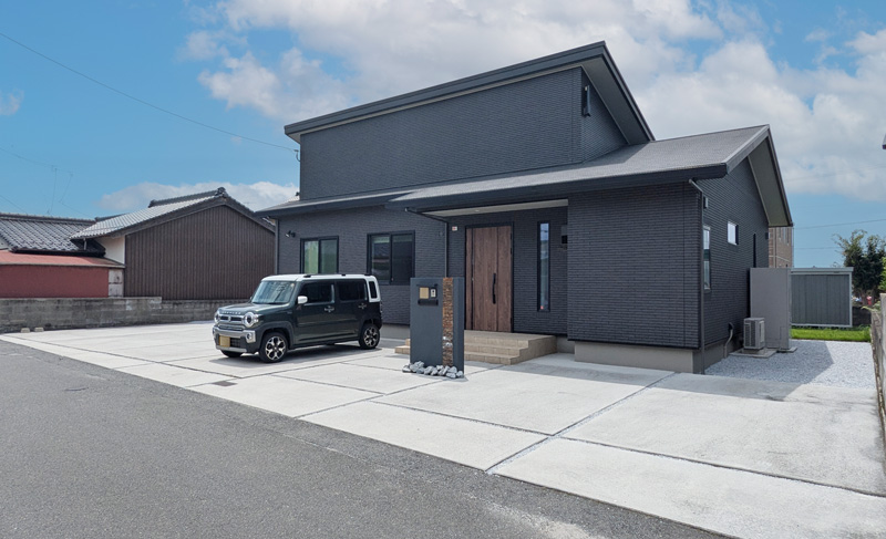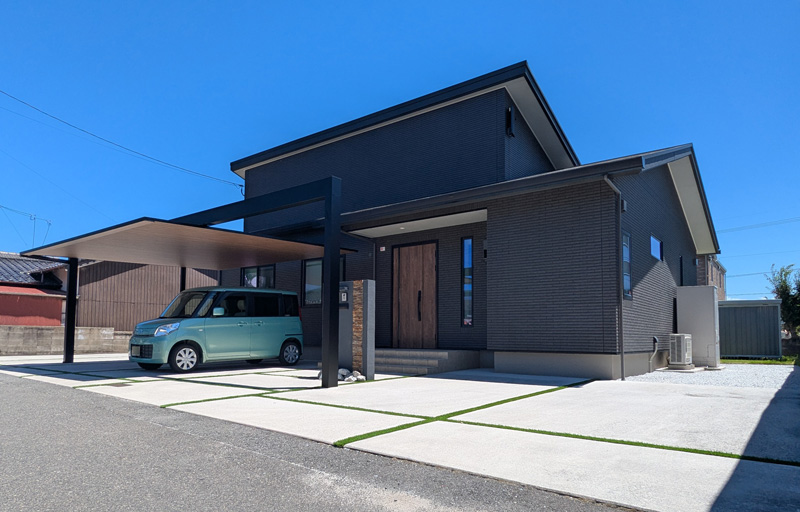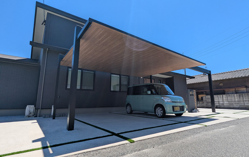 車の出し入れがしやすいように前梁を延長し、建物の外壁に合わせて柱と梁はブラック(KC)に、屋根は木調のクラフトチェリーを選びました。