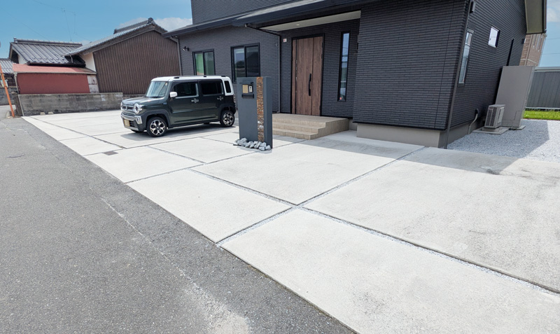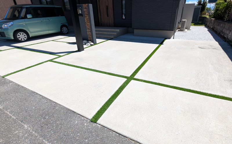 モノトーンの外構に木調の屋根と芝の緑が映える、機能性とデザイン性を兼ね備えた駐車場になりました。