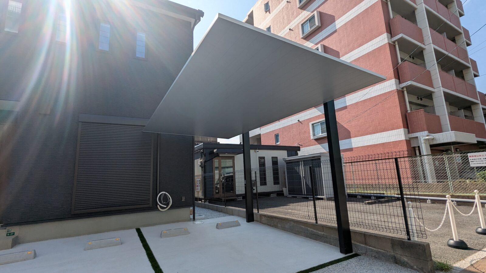 機能門柱は、カーポートSCに合わせてカラーをセレクトし、シンプルでありながらも高級感のある仕上がりにしました。門柱には宅配ボックスも設置し、機能性もバッチリ。使い勝手の良さを追求したデザインが完成しました!