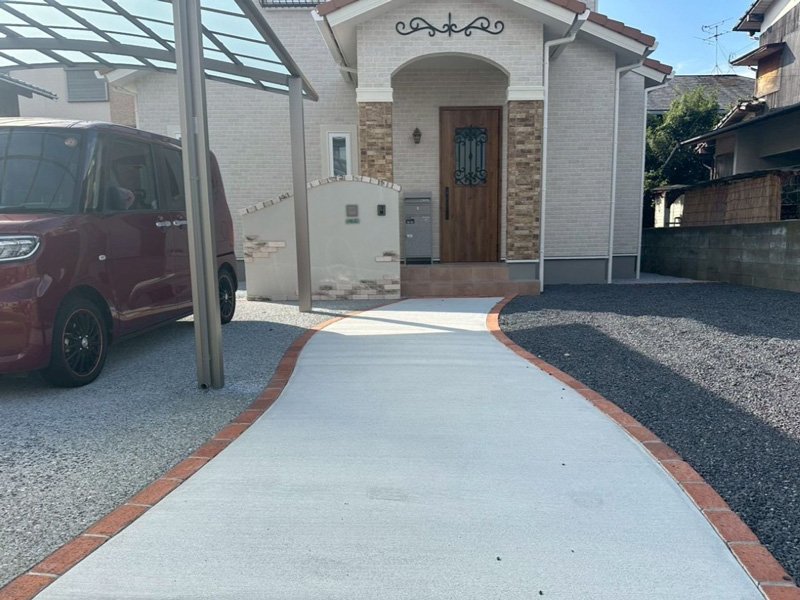 玄関へ続くアプローチには白色が映える刷毛引きコンクリートを打ち、レンガラインで縁取りしました。