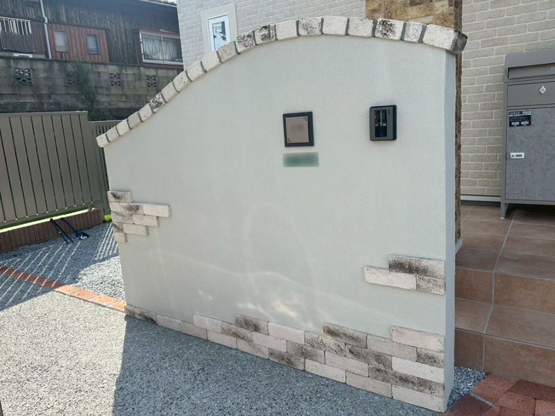 門袖はジョリパットローラー仕上げ、柔らかな曲線の笠木と白いレンガをアクセントにしました。
