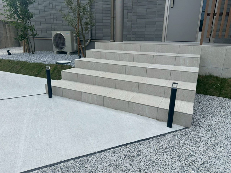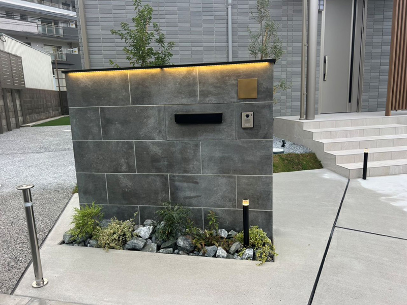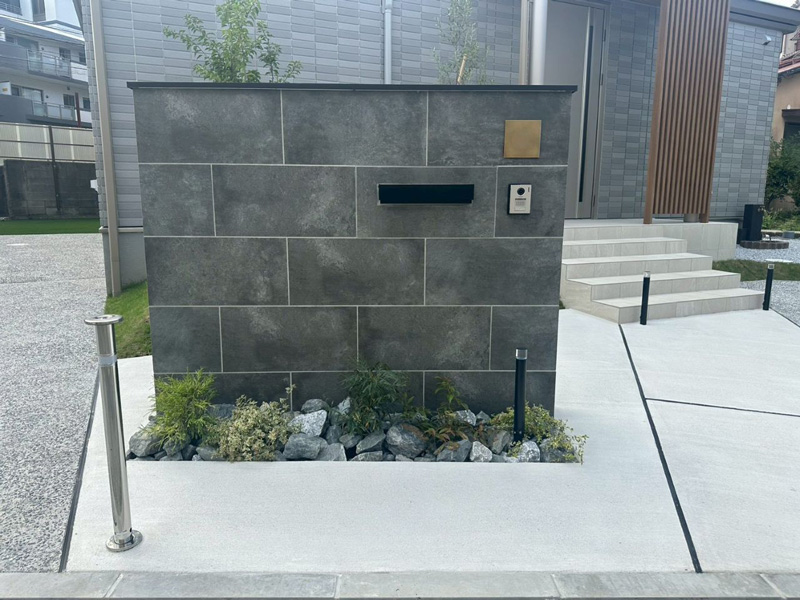 アプローチの手前には、建物の外壁と調和するモノトーンでシックな門袖を設置しま
