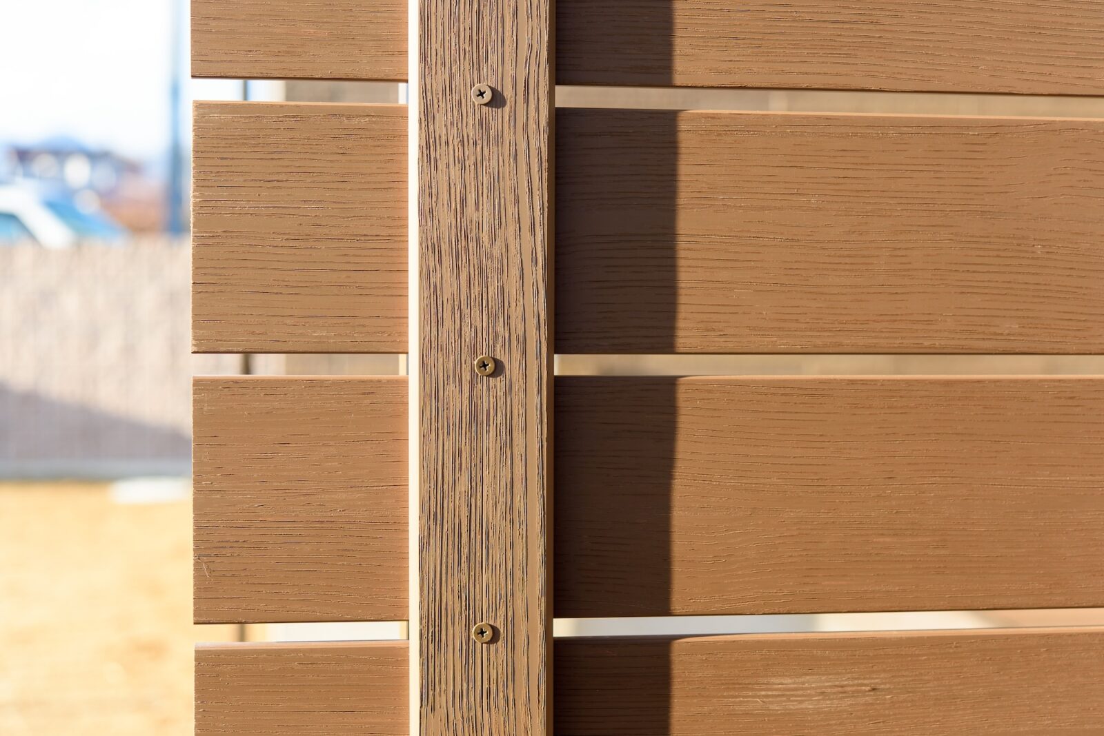 エクシスランドさんから発売されている「Eウッドフェンス」はスリットの幅を調整できるタイプで、腐らない素材である人工木を使用しています。アルミ製フェンスとはまた違った温かみがある点も魅力的ですね。