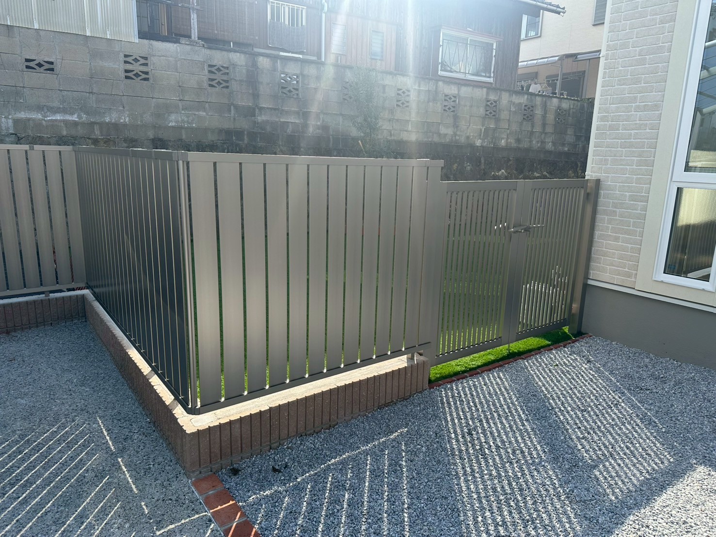 まずはじめに検討したのは、O様からもご要望があったお庭の目隠しとペットの飛び出し防止用のフェンスです。最終的にセレクトしたのは、LIXILさんの「フェンスAB(TS2型)」の縦格子フェンス。こちらに合わせて、隙間に気をつけながら門扉の施工を行いました。