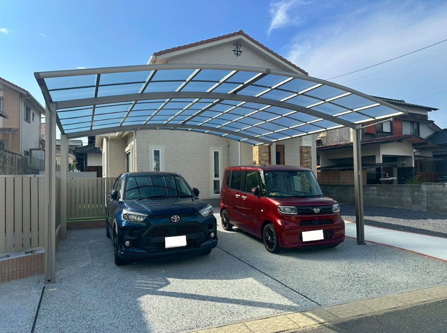 カーポートについても、丸みのある柔らかいデザインを意識し、LIXILさんのカーポート「ネスカ(R型)」を採用しております。柱はロング柱のため、将来的に車高の高い車に乗り換えても安心です!