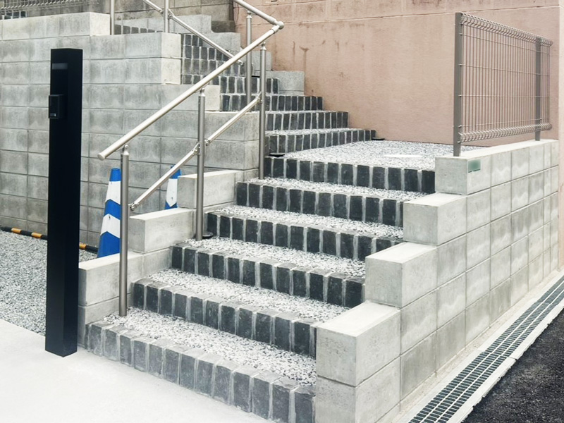 道路から建物の高さまで上がる16段の階段を新たに設け、蹴上げ部分はピンコロで仕上げてデザイン性を高めています。
