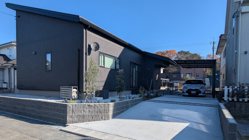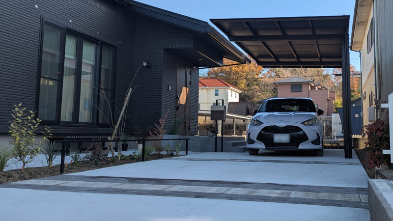 外構全体は建物に合わせて落ち着いたブラック系でまとめ、機能性と上質感を兼ね備えた外構が完成しました。