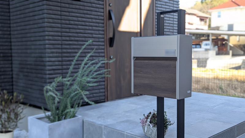 玄関前にはポール建てタイプのポストを設置し、玄関ドアと色味を揃えた木調デザインで統一感を演出しています。