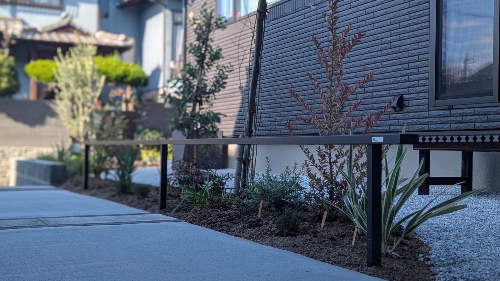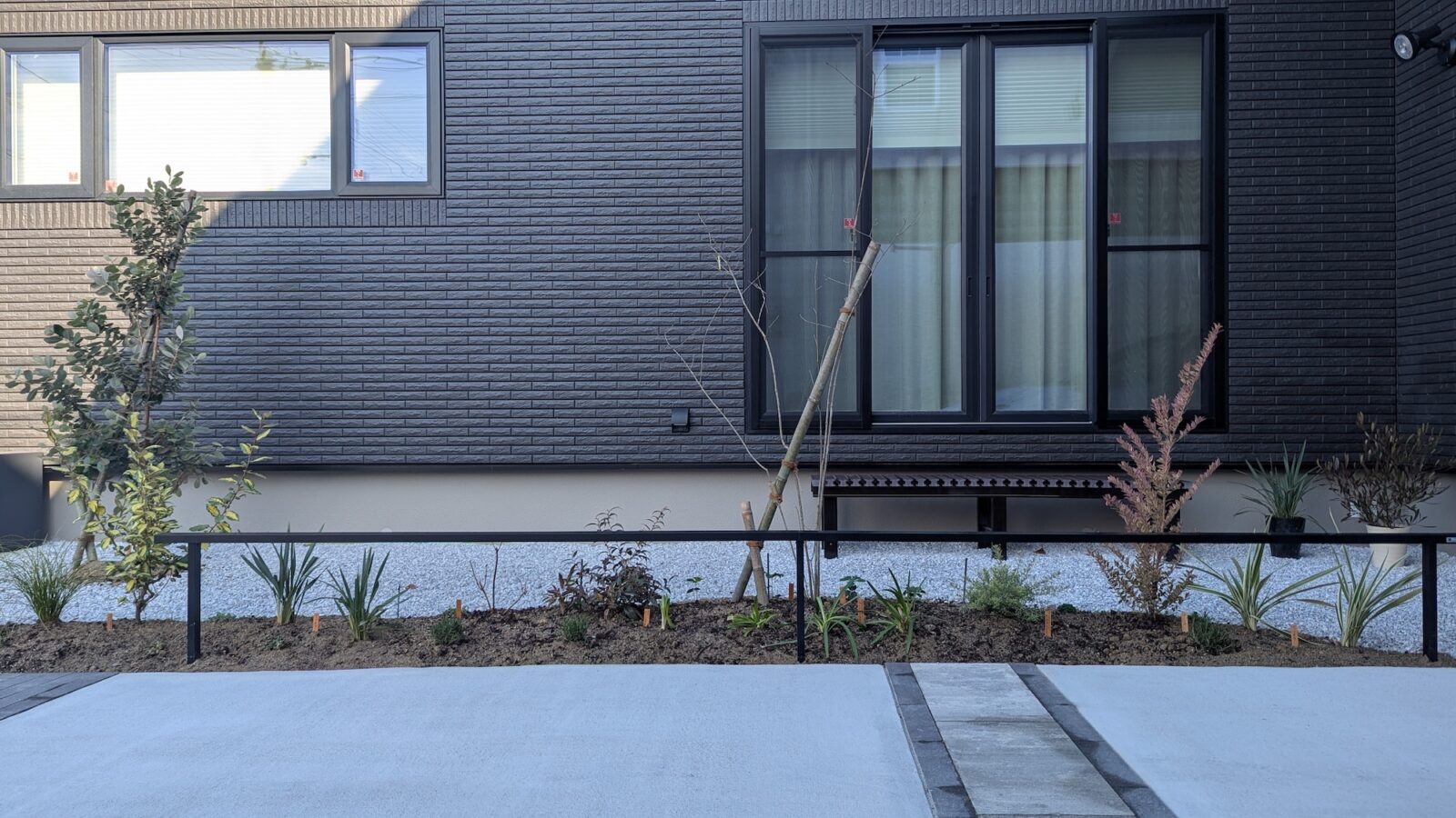 Y様よりいただいたご要望は「建物全体と調和するお庭」と「スロープを登るにつれて、植栽を楽しめる空間」。派手さよりも、長く付き合える落ち着いた外構を目指し、打ち合わせを重ね、プランを固めていきました。