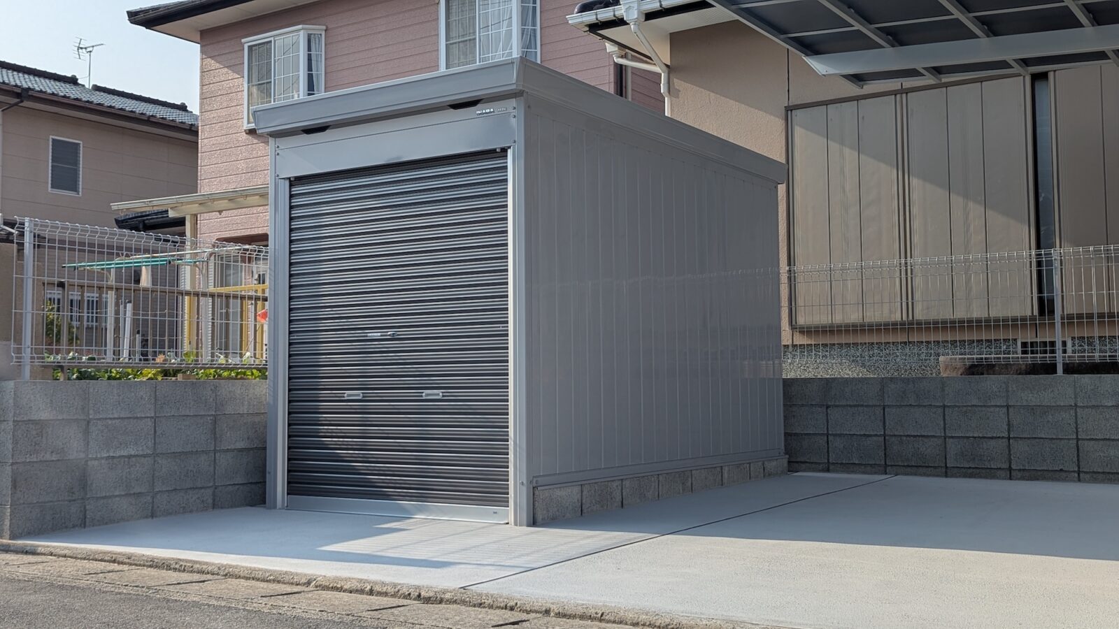 バイク置き場には、イナバさんの「バイク保管庫」を設置。あわせて、カーポートにはLIXIL「ネスカ」1台用を採用し、バイク倉庫とカラーを揃えることで、統一感のある外構に仕上げております。