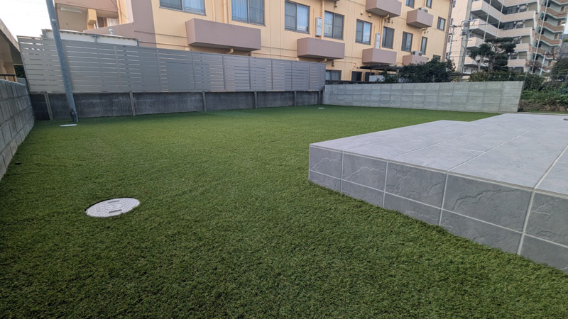 広々としたお庭スペースには、施主様ご支給の人工芝を施工しました。