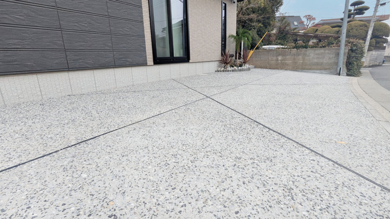 駐車場は車の出入りのしやすさを考え、斜め駐車を前提としたレイアウトとし、目地でデザイン性も高めています。