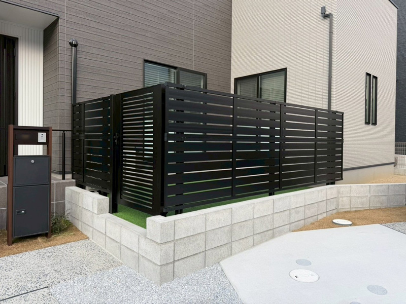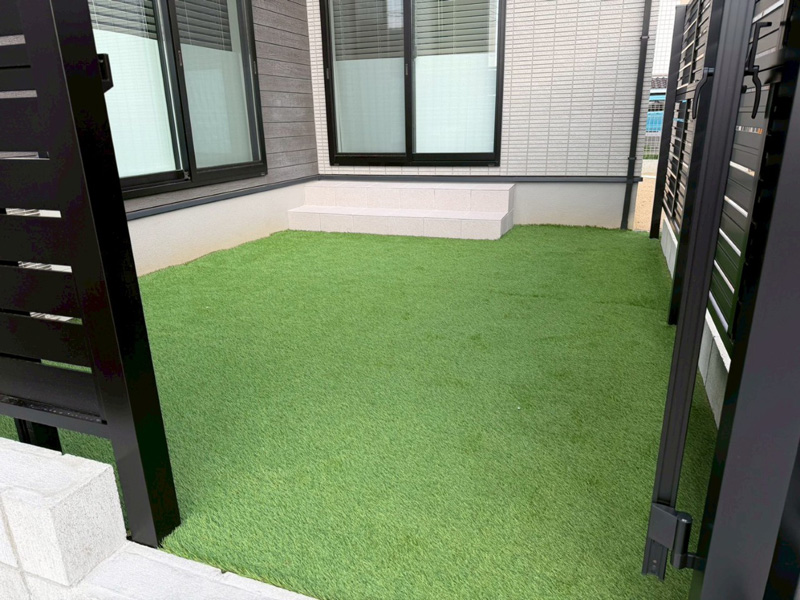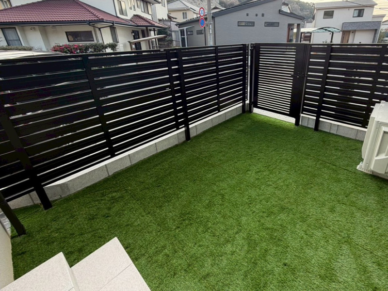 お庭の外周には目隠しフェンスを設置し、道路からの視線を気にせず、家族がのびのびとくつろげるプライベートな人工芝のお庭が完成しました。