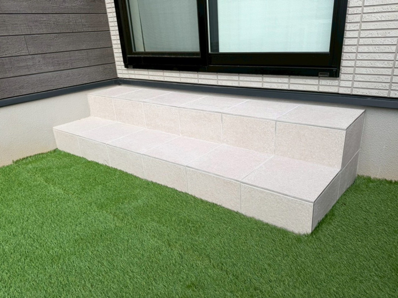 また、掃き出し窓からお庭へ楽に降りられるよう2段のタイルステップを新設し、使い勝手が向上しました。