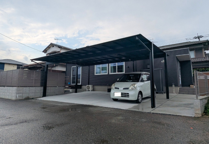 <INFORMATION> E様邸 福岡県北九州市 新築外構工事(カーポート・フェンス・人工芝・コンクリート施工) ● 広い駐車スペースとデザイン性を両立 新築